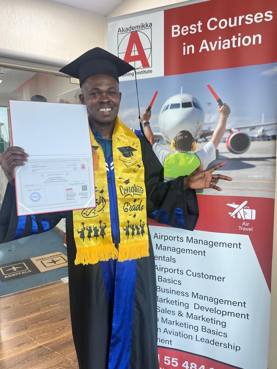 Jacob, a graduate of our Airlines & Airports Customer Service Basics program at Akademikka Training Institute, is now working with Alpha Flight Catering at Sharjah International Airport in Facility Cleaning Services. His dedication ensures a clean, safe, and welcoming environment that supports smooth airport and airline operations
